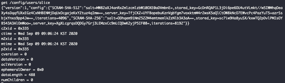 사용자 정보는 kafka-configs.sh 커맨드로 확인할 수 있는데, 주키퍼에 저장된 정보와 동일하게 제공된다.