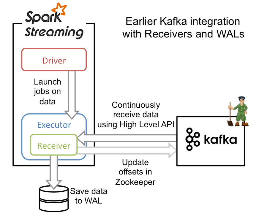 직접 모델이 나오기 전에 사용되던 리시버 모델이다. 각 executor(이하 익스큐터)에 리시버가 존재하고 리시버에 의해서 카프카의 데이터를 가져온다. 리시버가 카프카 컨슈머가 된다. 내결험성을 위해 리시버는 WAL(Write Ahead Logs)를 기록한다. 데이터 처리 실패 시 WAL은 데이터 재처리에 활용된다.