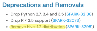 이유는 3.1.0 버전에서는 hive 1.2도 지원이 종료되었기 때문입니다(필자는 hive 1.2도 사용).