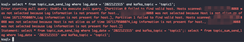 필자는 ksql.service.id를 실수로 다르게 설정하고 HA 구성이 안된다고 오류를 본 적이 있다. HA 구성했다고 생각하고 table을 만든 서버와 다른 서버에서 pull request를 요청했을 때, 아래와 같이 오류가 발생했다.