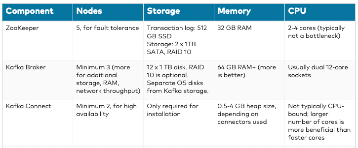 첫 번째로는 서버 리소스 낭비를 막고 최적의 리소스를 사용하는 효율성을 갖게 된다. Kafka Connect는 외부 레파지토리와 Kafka 간의 데이터 이동을 위해 만들어진 시스템이다. Kafka Broker와 같이 많은 자원을 필요로 하지 않는다. 아래 그림 1은 컨플루언트에서 제공하는 문서에서 발췌해서 가져왔다. Kafka 컴포넌트별로 필요한 서버 자원을 보여준다.