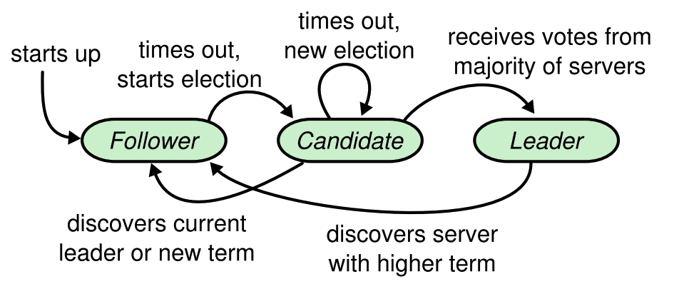 leader는 하나만 존재하며 모든 클라이언트로부터의 요청을 받는 역할을 한다. 처음 시스템이 시작되었을 때, 모든 서버들은 follower 상태로 시작한다. 반복적인 선정 과정을 통해 leader를 정하게 되고 leader로 계속 확인 받는 과정을 통해 leader로서 역할을 계속 수행할 수 있다. 아래 그림1로 각 상태의 변화 과정을 한 눈에 볼 수 있다.
