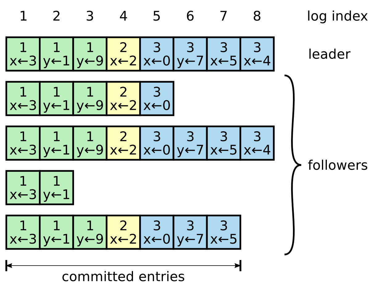 로그 안에는 일정하게 증가하는 index와 term 번호를 포함한다. 2개의 값으로 leader와 follower 각 서버의 상태가 동일함을 증명한다. 아래 그림 3과 같이 로그 index는 순차적으로 증가하며 term 별로 다른 색으로 구분된 것을 볼 수 있다.