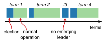 앞서 leader 선정을 반복적인 선정 과정이 있다고 했다. 반복적인 단계의 구분은 term으로 이루어진다. Raft는 연속적으로 증가하는 integer를 포함하는 임기(term)로 나누어진다. 각 서버들은 현재 term (current term)를 보관하고 있다. 서버가 다른 서버들과 통신하면서 current term을 주고 받는데, 받은 term이 서버가 가진 current term 보다 큰 값이면 교체한다. 큰 값이 더 최신의 상태를 의미하기 때문이다. 그리고 서버의 현재 상태를 follow로 전환한다.