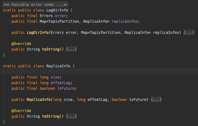 Admin API를 보면 describeLogDirs 메서드가 존재한다. 파라미터로 브로커들의 ID 리스트를 전달하면 전달한 브로커들의 모든 로그 디렉토리 정보를 리턴한다.