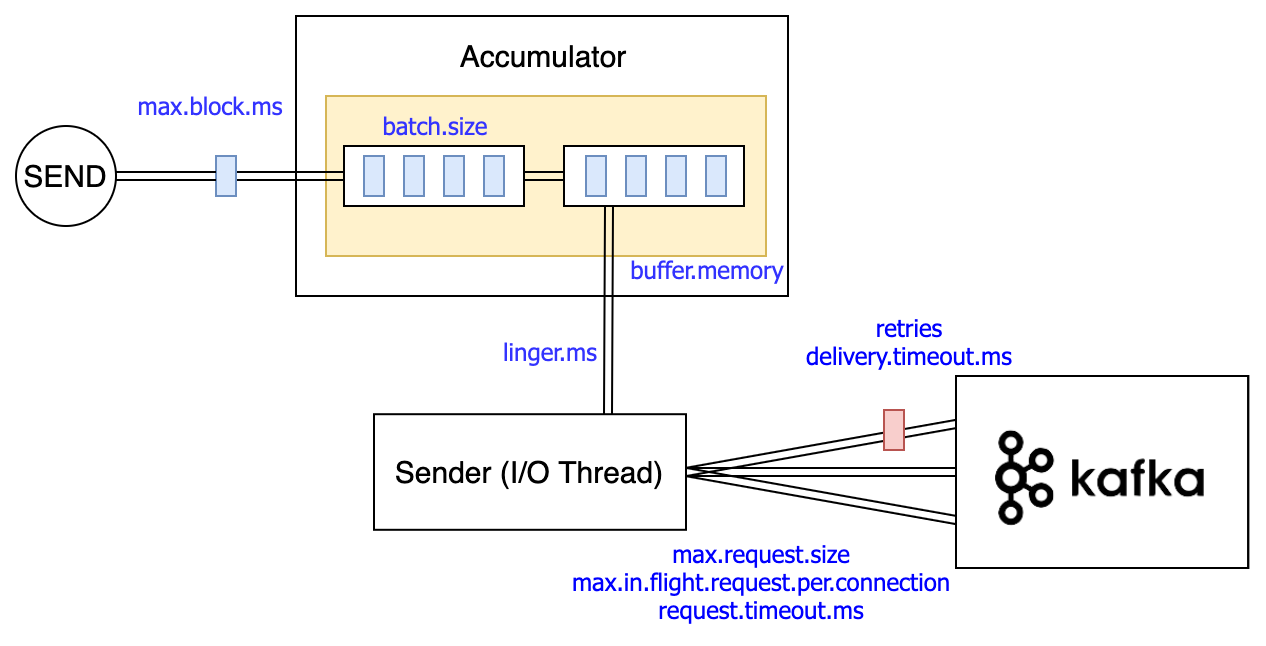 그래서 실제로 브로커에 데이터를 발송하기 전까지 데이터를 모아둘 버퍼가 필요하며, 얼마만큼 모아서 보내고, 보낸 데이터의 성공을 어떻게 체크할 지 등의 로직이 설정값에 녹여져 있다.
